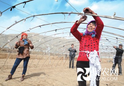 2月29日,在什川鎮萬畝標準化生產基地,農民們正在搭建雙桿四膜瓜菜溫室大棚骨架,皋蘭縣春耕生產正從黃河岸邊的南部什川鎮向北部山區黑石鎮延伸。