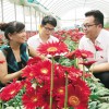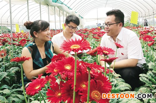8月8日,江西吉安銀監分局工作人員(右)來到吉水縣黃橋鎮沈塘村金太陽花卉種植基地,向花農了解該縣農商銀行“產業扶貧信貸通”貼息扶貧貸款發放后基地花卉生產情況。